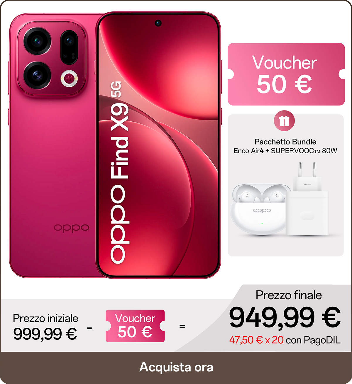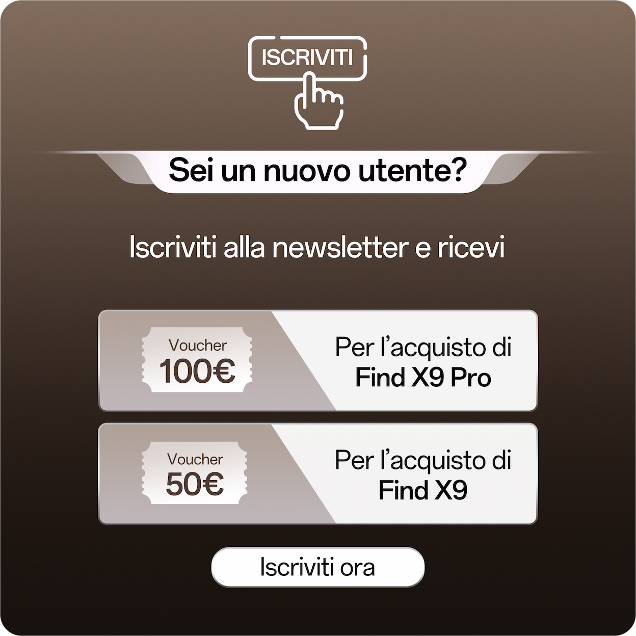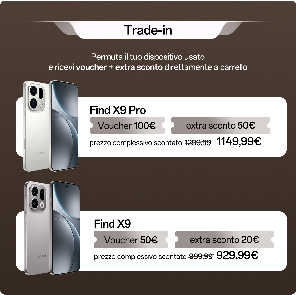 Iniziativa promozionale con periodo di registrazione (da intendersi la verifica IMEI direttamente sul sito tramite l'apposita funzione per coloro che possiedono un dispositivo OPPO, oppure, tramite iscrizione alla newsletter per coloro che non possiedono un dispositivo OPPO) effettuabile dal 28 ottobre al 30 novembre 2025. Lo sconto ammonta a 100 euro per l'acquisto di Find X9 Pro, e di 50€ per l'acquisto di Find X9 esclusivamente su oppostore.it. Il voucher è utilizzabile esclusivamente dal 28 ottobre 2025 al 30 novembre 2025.