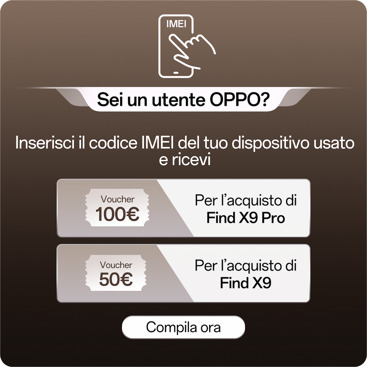 Promozioni Approfitta del tuo sconto esclusivo! Verifica l’IMEI del tuo dispositivo OPPO, iscriviti alla newsletter oppure partecipa al trade-in per ottenerlo.