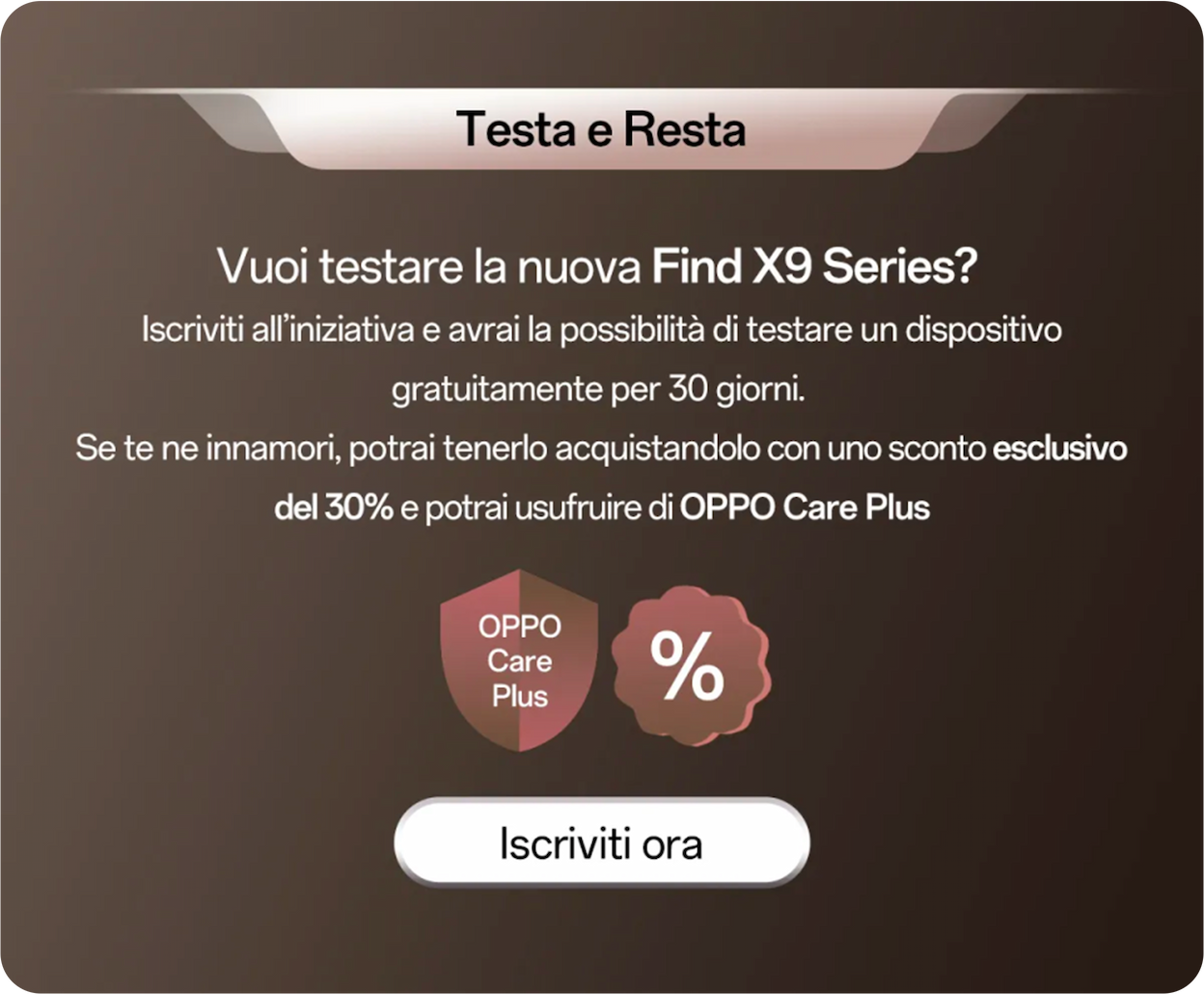 Iniziativa promozionale con periodo di registrazione (da intendersi la verifica IMEI direttamente sul sito tramite l'apposita funzione per coloro che possiedono un dispositivo OPPO, oppure, tramite iscrizione alla newsletter per coloro che non possiedono un dispositivo OPPO) effettuabile dal 16 ottobre al 27 ottobre 2025. Lo sconto ammonta a 100 euro per l'acquisto di Find X9 Pro, e di 50€ per l'acquisto di Find X9 esclusivamente su oppostore.it. Il voucher è utilizzabile esclusivamente dal 28 ottobre 2025 al 30 novembre 2025.