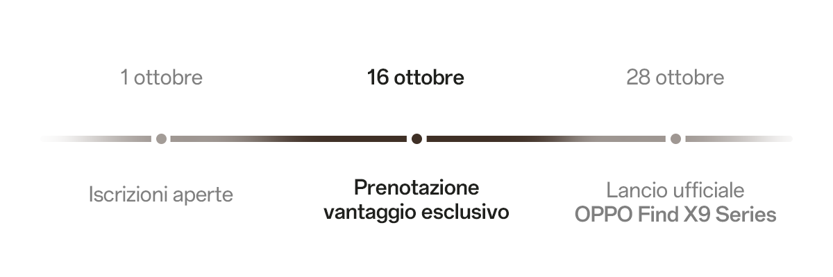 L’inserimento del codice IMEI serve a verificare l’idoneità a ricevere un codice sconto personale, non cedibile e soggetto alle condizioni ivi indicate. Tale codice sconto può essere utilizzato esclusivamente per l'acquisto di OPPO Find X9 Series, non ancora in commercio. Iniziativa promozionale di scontistica, con periodo di validità dal 16 ottobre al 27 ottobre non soggetta alla normativa in materia di manifestazione a premi DPR 430/2001. I dati personali, compreso l'IMEI, sono trattati esclusivamente per l’esecuzione dell’iniziativa di scontistica, ai sensi del Regolamento 679/2016. Testo integrale dell'informativa disponibile su www.oppostore.it