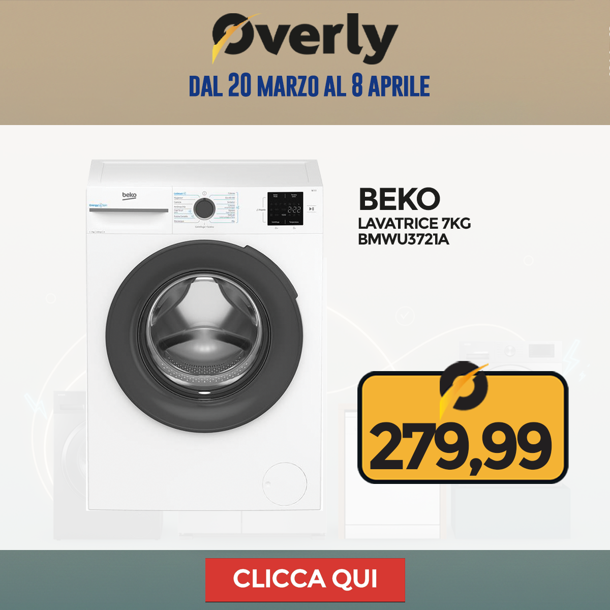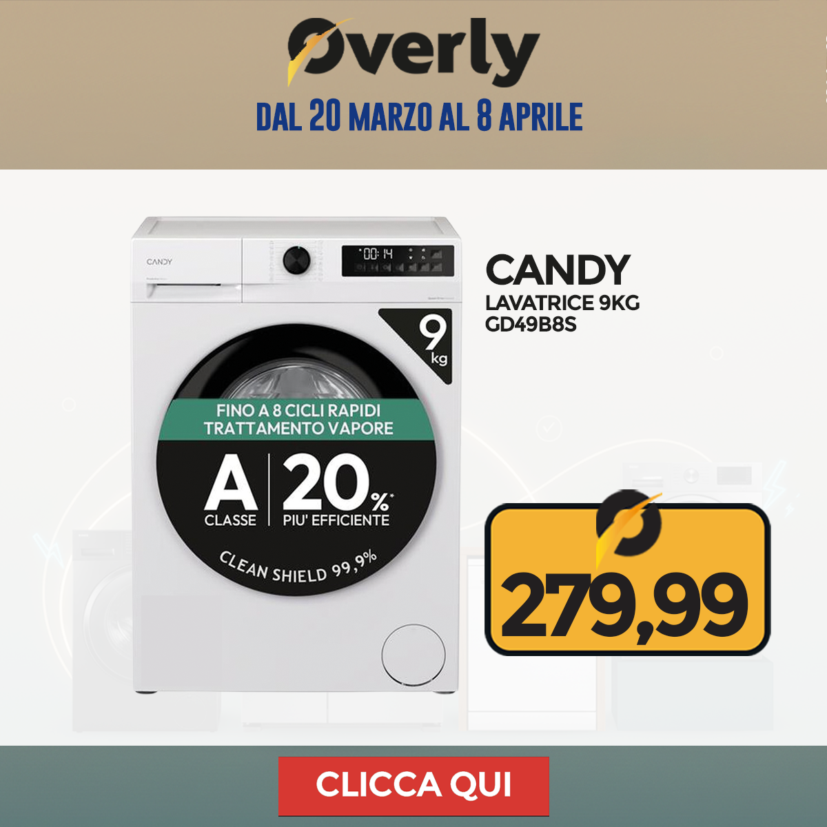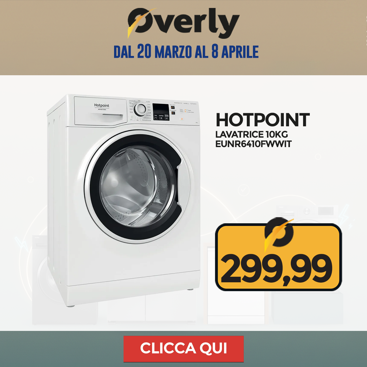 Grandi Elettrodomestici, grandi occasioni! Dal 20 marzo all'8 aprile, è il momento giusto per rinnovare la tua cucina o lavanderia: frigoriferi, lavatrici, asciugatrici e lavastoviglie ti aspettano su Overly a prezzi imperdibili.