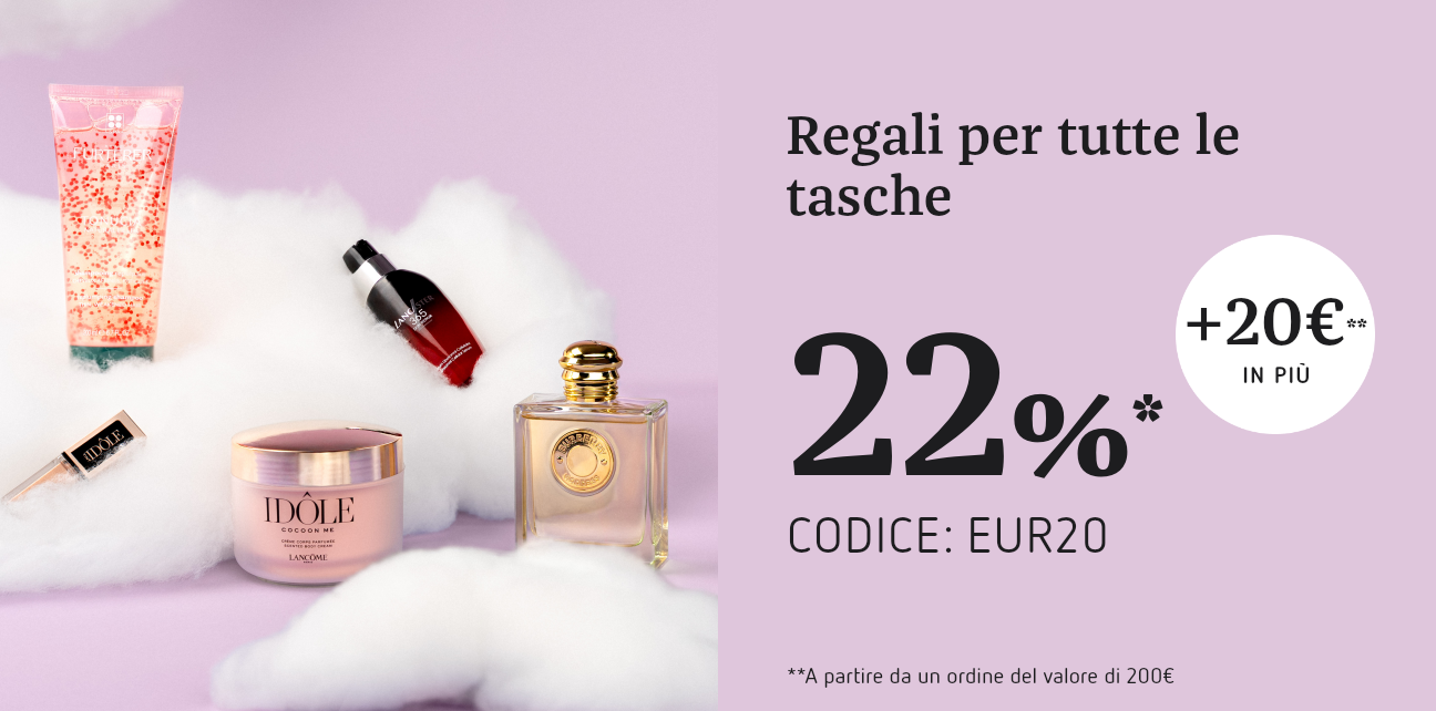 Dillo con la bellezza! Che si tratti di un piccolo pensiero o di un grande gesto: scopri i nostri regali di bellezza per San Valentino perfetti per il tuo budget e assicurati uno sconto del 22%* + 20€** su ordini superiori a 200€ su profumi, make-up, prodotti di cura della pelle e molto altro.
