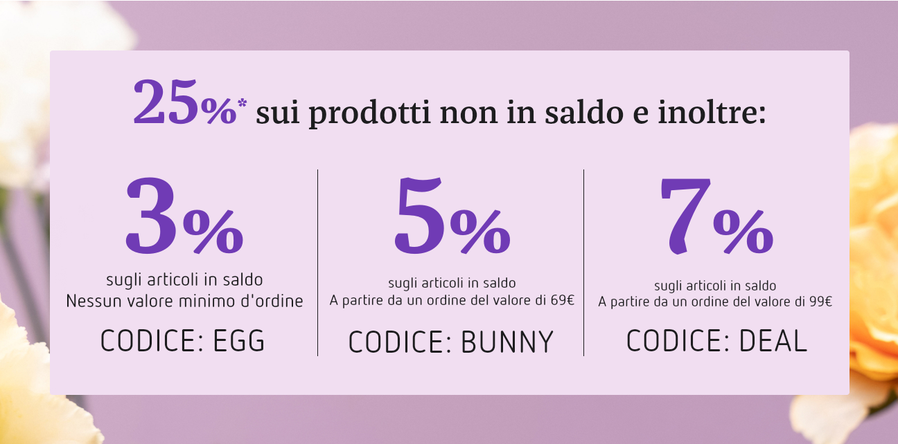 25%* + 5%** sugli articoli in saldo a partire da un ordine del valore di 69 €. CODICE: BUNNY