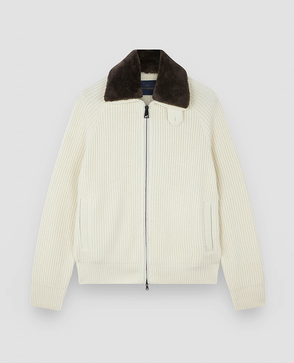 Il cardigan in Re-Wool con collo rimovibile in faux fur ridefinisce il concetto di maglieria: calore, lusso e versatilità in un unico capo.