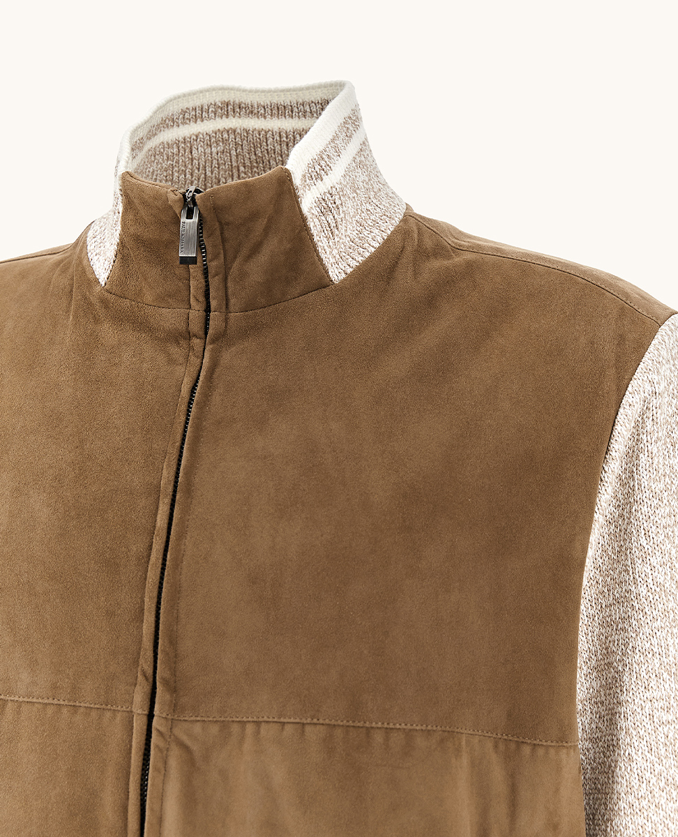 Essenzialità formale e qualità dei materiali caratterizzano questo bomber in Aqualeather. La pelle scamosciata idrorepellente è trattata per offrire morbidezza e comfort, completata da dettagli a costine che donano equilibrio e personalità al capo.