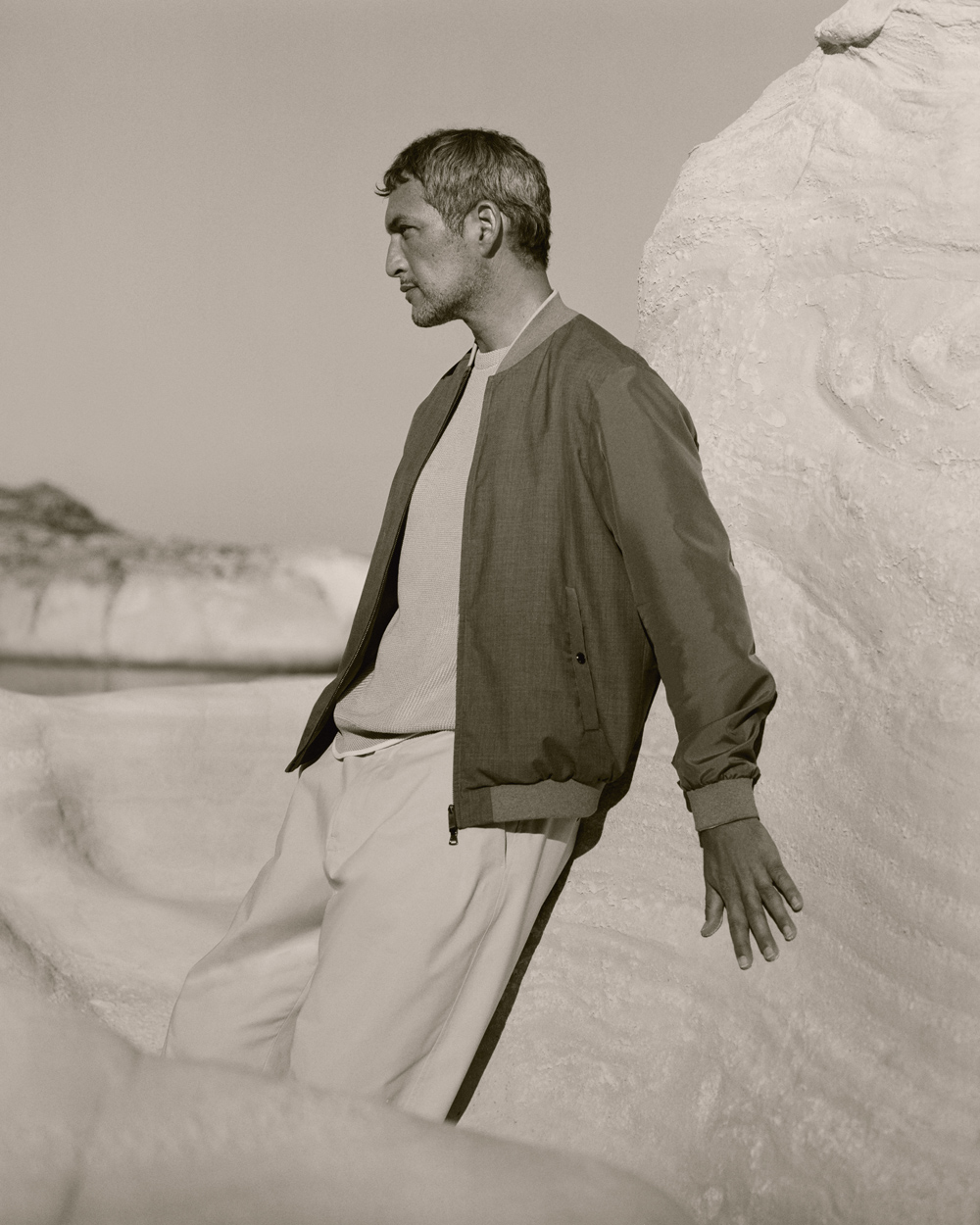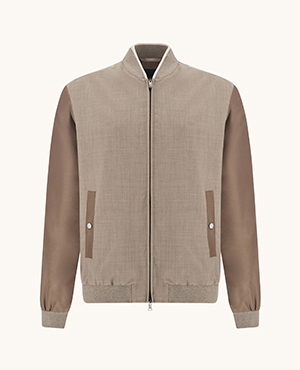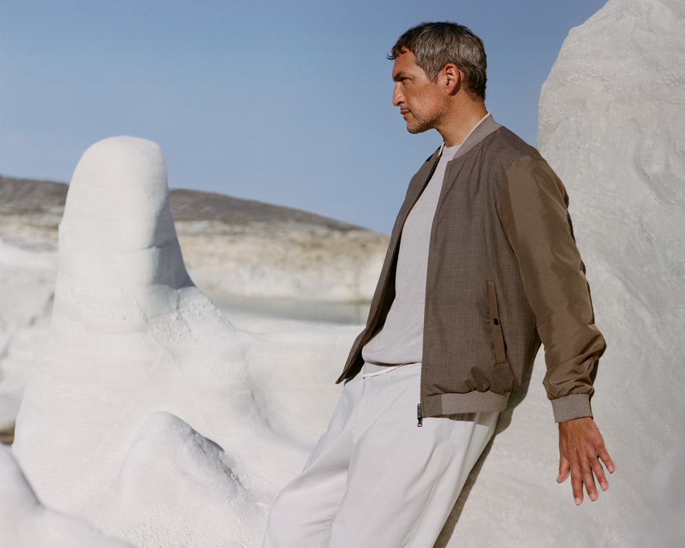 Il capospalla introduce il viaggio con un blend di lana e seta arricchito da dettagli in pura seta, per un equilibrio tra protezione e luminosità.