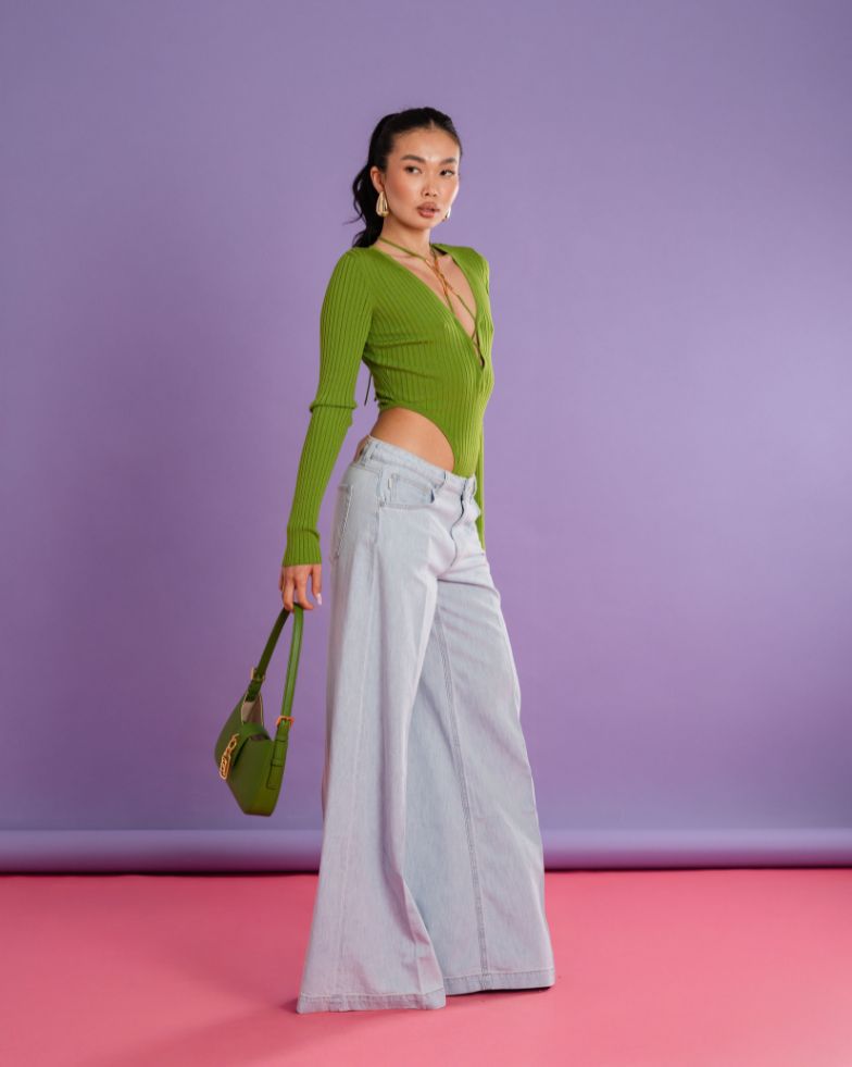 💚 TOUCH OF COLOR Il verde è protagonista: body cut-out e denim chiaro per un look fresco e d’impatto.