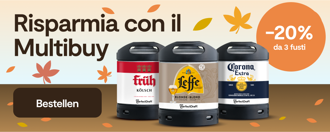 *-10% per 1 fusto, -15% per 2 fusti, -20% da 3 fusti. L’offerta è valida solo ed esclusivamente su una selezione di fusti singoli con il bollino giallo alla pagina www.perfectdraft.com/it-it/fusti, fino a esaurimento scorte. Lo sconto si applica automaticamente nel carrello ed è valido fino alle 23:59 del 09.10.2025. Durante questo periodo gli sconti KEG3 e KEG6 non sono validi.