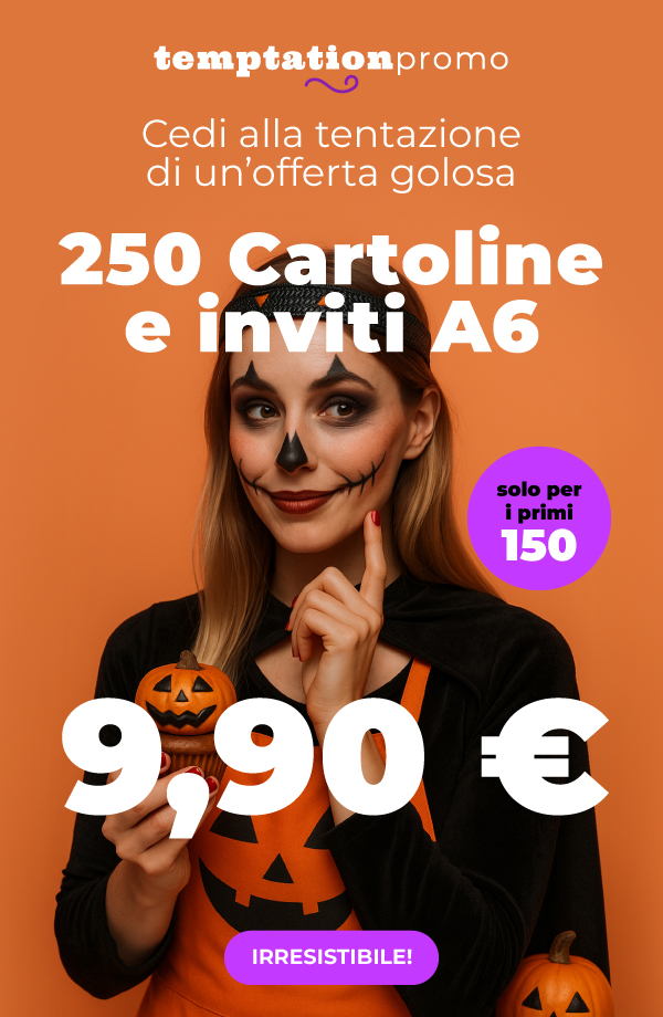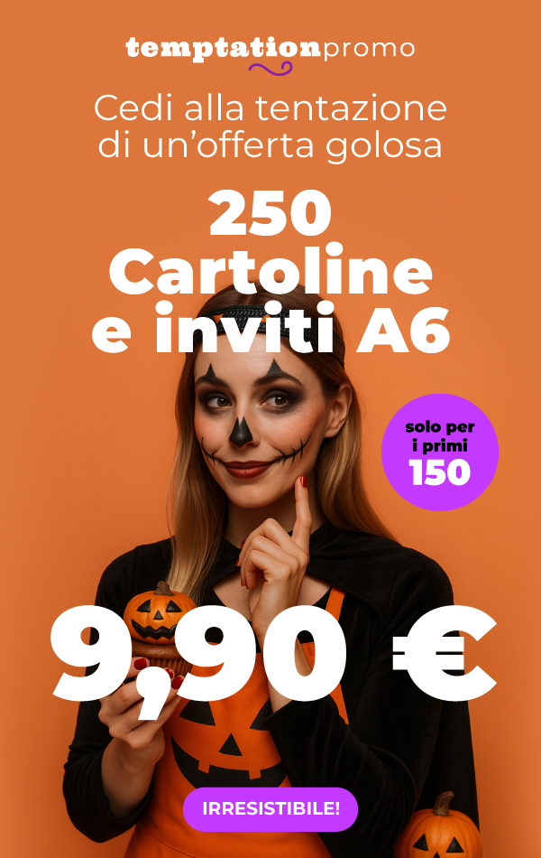 | *Offerta valida per 150 lavorazioni complessive di 250 cartoline e inviti classici formato A6, carta patinata opaca 300 gr, scegliendo la data di consegna più lontana. Prezzo IVA esclusa. Limite di una lavorazione per cliente. Lo sconto non è cumulabile con altri codici promozionali, offerte o sconti, e non può essere applicato a merce precedentemente acquistata o su ordini annullati. |  |
