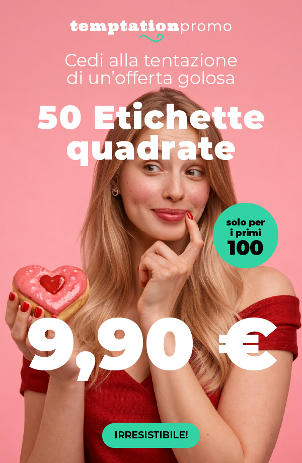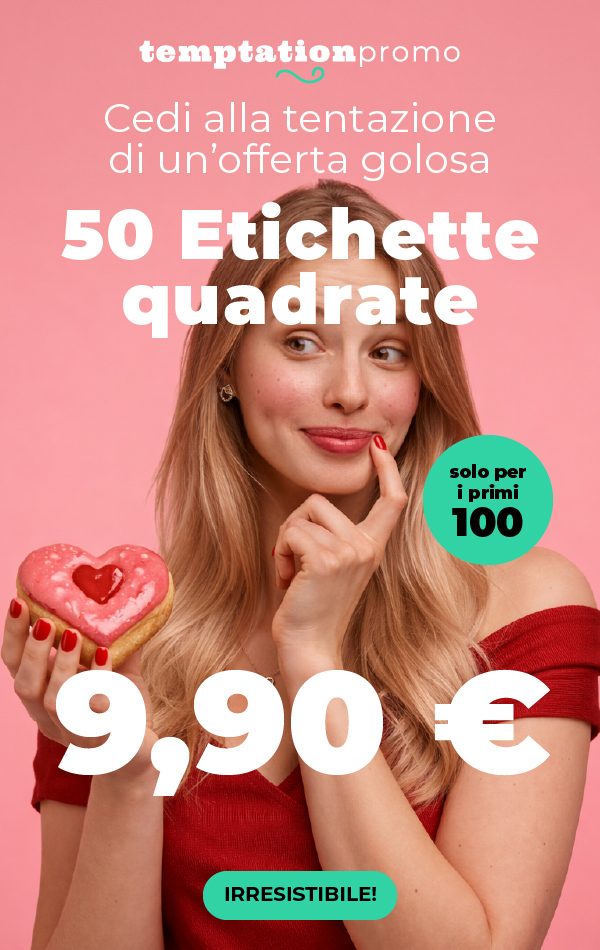 *Offerta valida per 100 lavorazioni complessive di 50 etichette quadrate, formato 5x5 cm in Polipropilene deluxe bianco, scegliendo la data di consegna più lontana. Prezzo IVA esclusa. Limite di una lavorazione per cliente. Lo sconto non è cumulabile con altri codici promozionali, offerte o sconti, e non può essere applicato a merce precedentemente acquistata o su ordini annullati. |
