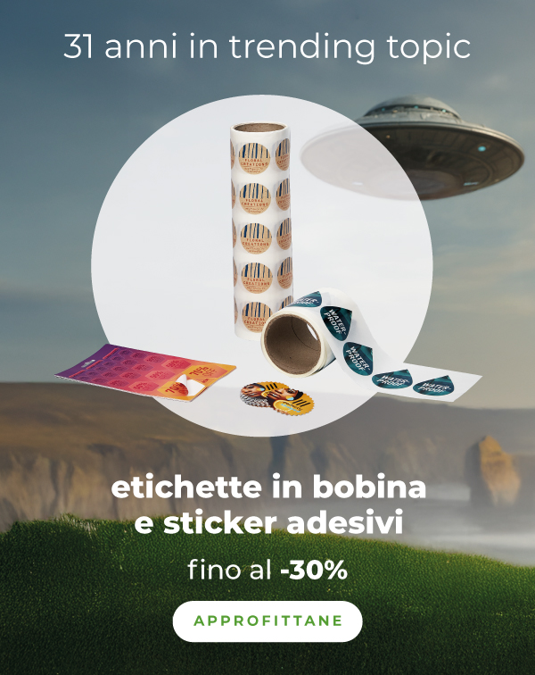 *L'offerta è valida fino alle ore 23:59 del 12/10/2025 su una serie di prodotti del catalogo con sconti variabili fino al -40%, scegliendo la data di consegna più lontana. Limite di 3 lavorazioni per cliente per ogni categoria in promozione. L'importo massimo di ciascuna lavorazione è pari a 500,00 €. Le spese di spedizione non sono gratuite per i prodotti adesivi resinati, etichette premium, etichette bianche in bobina e etichette bianche in foglio. Le categorie in promozione non si riferiscono necessariamente alle categorie merceologiche presenti sul sito. Qualora siano attive più promozioni sullo stesso prodotto, il sistema applicherà automaticamente quella con la percentuale di sconto maggiore disponibile per il cliente. Lo sconto non è cumulabile con altri codici promozionali, offerte o sconti, e non può essere applicato a merce precedentemente acquistata o su ordini annullati. | |