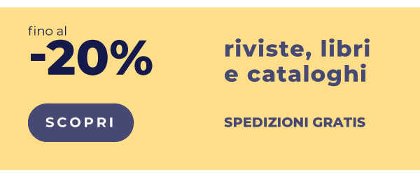 Offerta valida su: Riviste, libri e cataloghi, dalle 8:00 del 12/6/2023 alle 23:59 del 25/6/2023. Limite di lavorazioni per cliente: 5. Offerta valida sulla data di consegna più lontana. Le spese di spedizione non sono gratuite per i prodotti Brossura cucita filo refe, schede non rilegate, brossura grecata per alte tirature. Lo sconto non è cumulabile con altri codici promozionali, offerte o sconti, e non può essere applicato a merce precedentemente acquistata o su ordini annullati. |