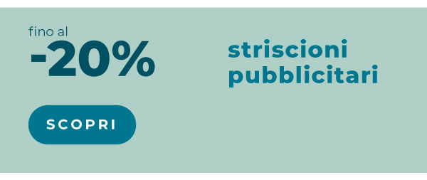 Offerta valida su: Striscioni pubblicitari, dalle 8:00 del 21/4/2026 alle 23:59 del 3/5/2026. L'importo massimo per ciascuna lavorazione è pari a 500,00 €. Limite di lavorazioni per cliente: 5. Offerta valida sulla data di consegna più lontana. Qualora siano attive più promozioni sullo stesso prodotto, il sistema applicherà automaticamente quella con la percentuale di sconto maggiore disponibile per il cliente. Lo sconto non è cumulabile con altri codici promozionali, offerte o sconti, e non può essere applicato a merce precedentemente acquistata o su ordini annullati.