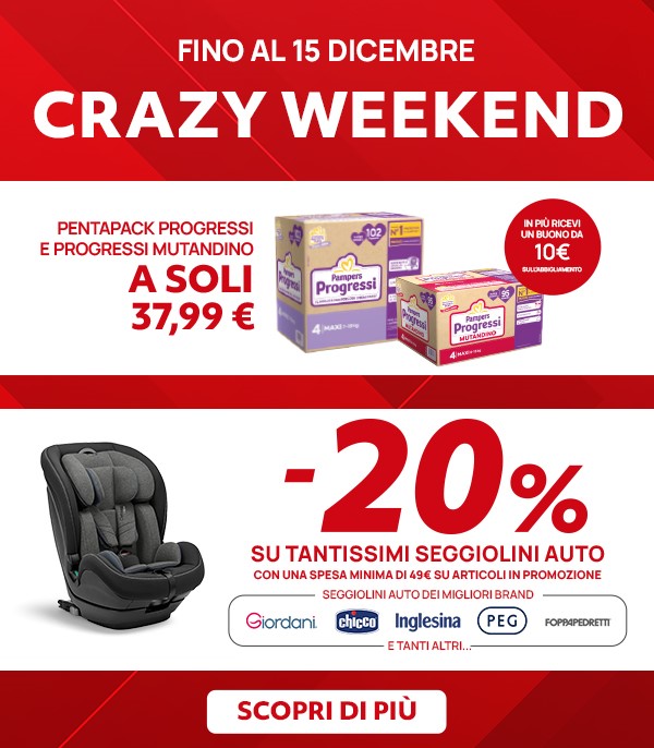 La promozione Crazy Weekend Pampers è valida fino al 15/12 per i soli possessori di una carta fedeltà Prénatal. Se acquisti online su www.prenatal.com, la promozione è valida sull'acquisto di minimo 2 pezzi. Il buono 10€ è valido fino al 21/12 su una spesa minima di 20€ di abbigliamento in un unico scontrino. Il buono sconto di 10€ ricevuto in negozio è spendibile solo in negozio; il buono sconto di 10€ ricevuto a seguito di un ordine online è spendibile solo online. I buoni non sono cumulabili tra loro ad eccezione dell'eventuale coupon Lover acquisito con il programma fedeltà Prénatal Lover.