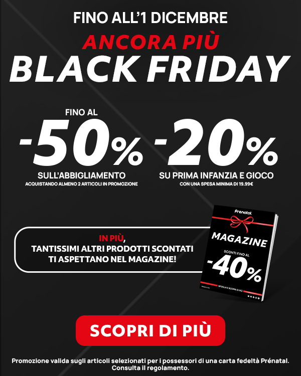 La promozione del Black Friday è valida fino all'1/12/2025 in negozio e online sui prodotti contrassegnati per i possessori di una carta fedeltà Prénatal.