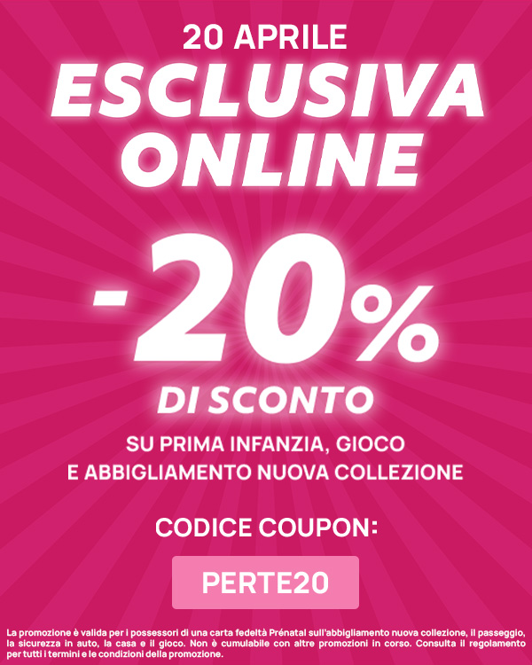 Solo per 24 ore, solo su prenatal.com o sull'App approfitta del -20% su tantissimi prodotti.