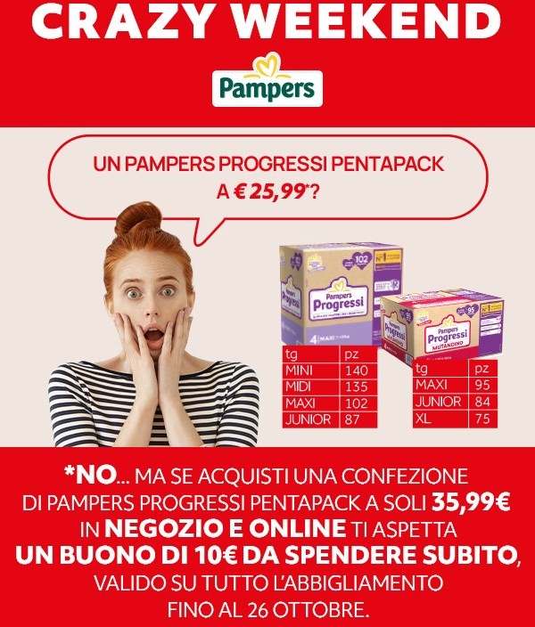 La promozione Crazy Weekend Pampers è valida fino al 20/10 per i soli possessori di una carta fedeltà Prénatal. Se acquisti online su www.prenatal.com, la promozione è valida sull'acquisto di minimo 2 pezzi.