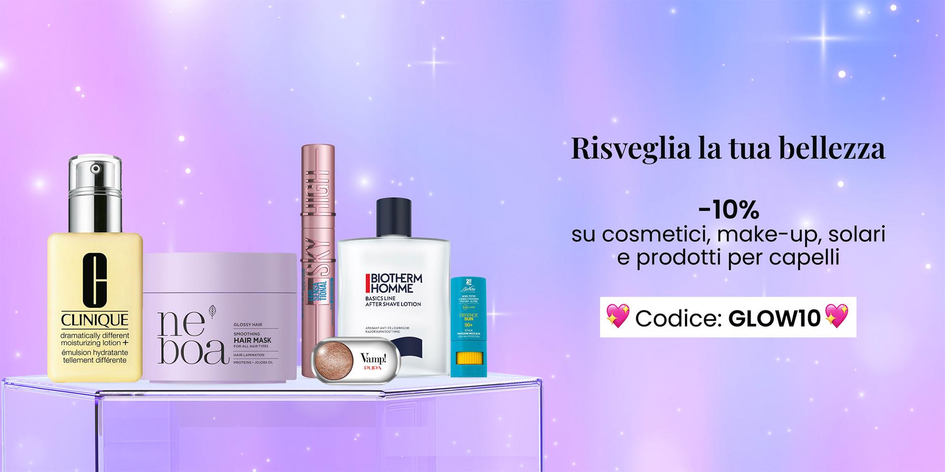 e avrai il 10% di sconto al checkout su cosmetici viso e corpo, make-up, solari e prodotti per capelli. |