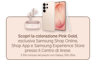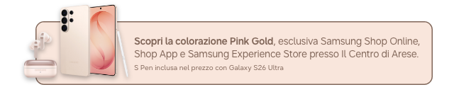 ***PayPal Iniziativa valida dal 25 febbraio 2026 al 10 marzo 2026 inclusi, per tutti coloro che acquistino su Samsung Online Shop o su Samsung Shop App, un Samsung Galaxy S26 (codice modello SM-S942B), Galaxy S26+ (codice modello SM-S947B), Galaxy S26 Ultra (codice modello SM-S948B), Galaxy Buds4 Pro (codici SM-R640), Galaxy Buds4 (codici SM-R540), Galaxy Book6 (codici NP760VJG-KG1IT, NP760VJG-KG3IT, NP740VJG-KA2IT, NP740VJG-KA3IT), Galaxy Book6 Pro (codici NP960XJG-KG1IT, NP960XJG-KG3IT, NP940XJG-KG1IT, NP940XJG-KG3IT), Galaxy Book6 Ultra (codice NP960UJH-XG6IT). Selezionando, in fase di acquisto, lo strumento di pagamento PAYPAL, sarà applicato uno sconto pari al 5% direttamente sul prezzo d’acquisto visibile su Samsung Online Shop o su Samsung Shop App del Prodotto Promozionato. L'iniziativa non è applicabile nel caso in cui si noleggi uno dei prodotti con il servizio Samsung Smart Upgrade. L’iniziativa è cumulabile con altre iniziative promozionali in corso promosse da Samsung Electronics Italia S.p.A. e con altri codici sconto emessi da Samsung Electronics Italia S.p.A. e spendibili sul Samsung Online Shop o su Samsung Shop App. Prezzi e disponibilità dei prodotti promozionati sono soggetti a variazioni. Agli acquisti si applicano le “Condizioni Generali di vendita di Samsung Online Shop”.
