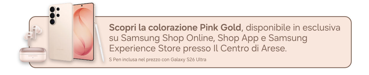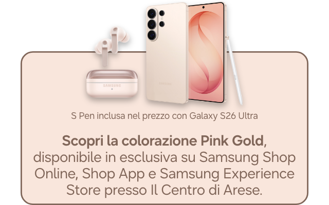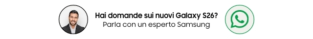 **PayPal Iniziativa valida dal 25 febbraio 2026 al 10 marzo 2026 inclusi, per tutti coloro che acquistino su Samsung Online Shop o su Samsung Shop App, un Samsung Galaxy S26 (codice modello SM-S942B), Galaxy S26+ (codice modello SM-S947B), Galaxy S26 Ultra (codice modello SM-S948B), Galaxy Buds4 Pro (codici SM-R640), Galaxy Buds4 (codici SM-R540), Galaxy Book6 (codici NP760VJG-KG1IT, NP760VJG-KG3IT, NP740VJG-KA2IT, NP740VJG-KA3IT), Galaxy Book6 Pro (codici NP960XJG-KG1IT, NP960XJG-KG3IT, NP940XJG-KG1IT, NP940XJG-KG3IT), Galaxy Book6 Ultra (codice NP960UJH-XG6IT). Selezionando, in fase di acquisto, lo strumento di pagamento PAYPAL, sarà applicato uno sconto pari al 5% direttamente sul prezzo d’acquisto visibile su Samsung Online Shop o su Samsung Shop App del Prodotto Promozionato. L'iniziativa non è applicabile nel caso in cui si noleggi uno dei prodotti con il servizio Samsung Smart Upgrade. L’iniziativa è cumulabile con altre iniziative promozionali in corso promosse da Samsung Electronics Italia S.p.A. e con altri codici sconto emessi da Samsung Electronics Italia S.p.A. e spendibili sul Samsung Online Shop o su Samsung Shop App. Prezzi e disponibilità dei prodotti promozionati sono soggetti a variazioni. Agli acquisti si applicano le “Condizioni Generali di vendita di Samsung Online Shop”.
