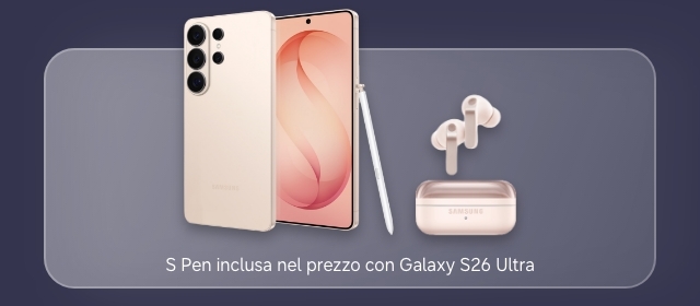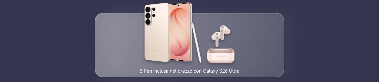 Offerta valida per l'acquisto di Galaxy S26 Ultra, S26+, S26 fino al 10/03/2026 su Samsung Shop Online o su Shop App. Il metodo di pagamento PayPal non è utilizzabile nel caso si intenda chiedere una valutazione dell'usato con trade-in GalaxyNow!