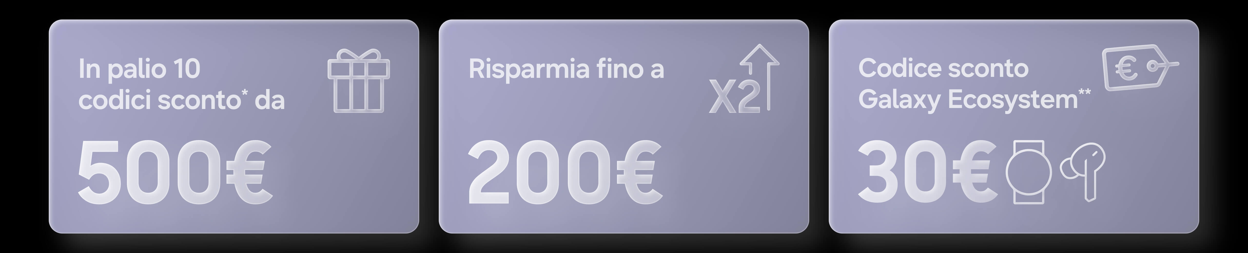 **Il codice sconto è emesso gratuitamente da Samsung Electronics Italia S.p.A. ed è spendibile in un’unica soluzione esclusivamente su Samsung Shop Online o su Samsung Shop App. Il codice sconto è valido per l’acquisto congiunto di un Samsung Galaxy tra quelli che verranno commercializzati per la prima volta a far data dal 25 febbraio 2026 unitamente ad un prodotto a marchio Samsung appartenente alle categorie “Galaxy Tab”, “Galaxy Book”, “Wearable” e dà diritto ad uno sconto di €30,00 sulla somma totale dei prodotti sopraindicati acquistati insieme. Ove fossero acquistati ulteriori prodotti in aggiunta a quelli sopra indicati, il codice sconto sarà applicato solo a questi ultimi. Il presente codice sconto non è nominativo e quindi liberamente cedibile a terzi. Il codice sconto può essere utilizzato entro e non oltre il 10 marzo 2026. Decorso il predetto termine, il codice sconto perderà automaticamente effetto. Il codice sconto non è rimborsabile, non dà diritto a resto e non si applica ad eventuali spese di spedizione. ll codice non è applicabile nel caso in cui si noleggi il prodotto con il servizio Smart Upgrade. Il codice sconto non è cumulabile con altri codici sconto emessi da Samsung Electronics Italia S.p.A. e spendibili su Samsung Shop Online o su Samsung Shop App. Agli acquisti si applicano le “Condizioni Generali di vendita di Samsung Shop Online”.