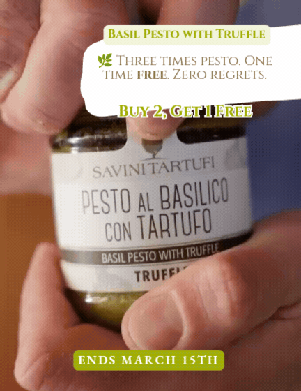 | Let's be honest: one jar is never enough. Our Basil Pesto with Truffle has this uncanny ability to disappear from the pantry before you've even had a chance to put it away. Pasta, bruschetta, spoon straight from the jar β we're not judging. From April 1st to 15th, we've decided to do the right thing: Buy 3 jars of Basil Pesto with Truffle and the third one is completely on us. Because anyone buying three already knows they'll need them. And anyone buying two usually lives to regret it. The discount is applied automatically at checkout β no code, no excuses not to treat yourself. π Visit savinitartufi.it Promotion valid from April 1st to 15th, 2026. While stocks last. |