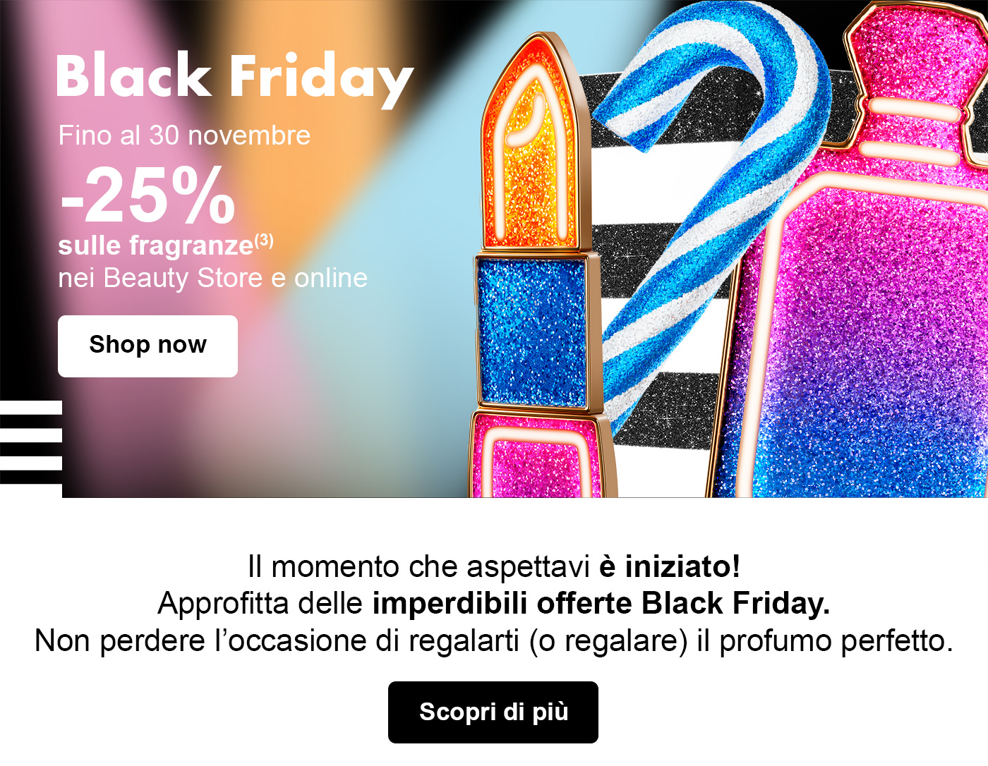 (3) Offerta valida dal 15 al 30 novembre nei Beauty Store e online. Sconto del 25% già applicato valido sulle fragranze. Offerta valida su tutti i prodotti ad esclusione dei servizi Sephora, Brow Bar Benefit, Seasonly e Hair Bar e dei prodotti delle marche Acqua Di Parma, Aesop, Armani Privé, Charlotte Tilbury, Fenty Fragrance, Jo Malone, Kayali, Le Monde Gourmand, Sol De Janeiro, Rare Beauty Fragrance, Tom Ford private blend. Offerta non cumulabile con altre offerte o buoni sconto in corso di validità. Per gli acquisti online, l’offerta è estesa anche al 1° dicembre. Offerta valida per la consegna secondo la modalità Click&Collect.