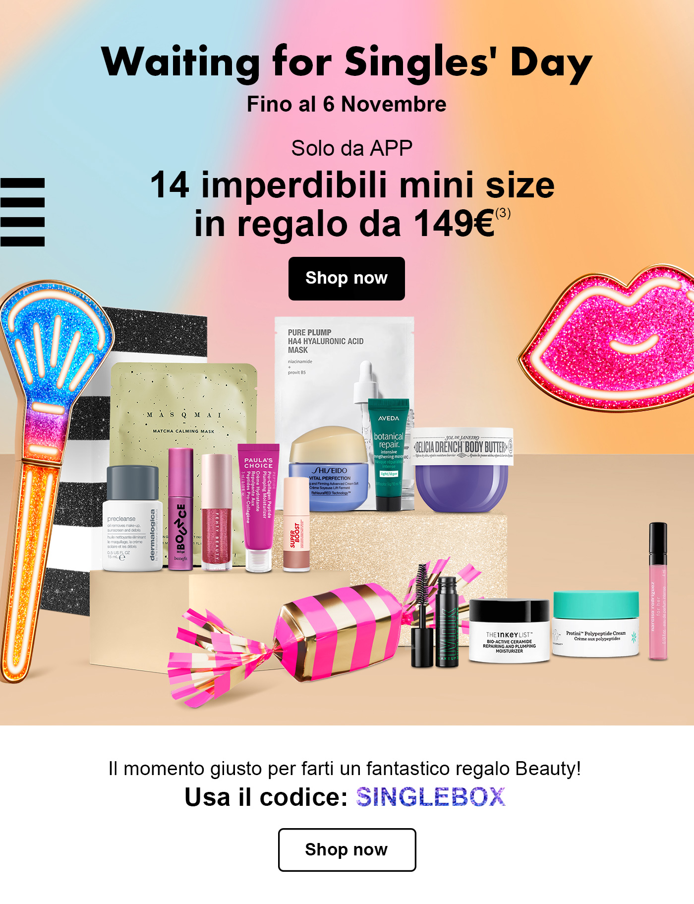 (3) Operazione a premi valida fino al 6 novembre 2025 su APP Sephora facendo un acquisto di almeno 149€, spese di spedizione escluse, inserendo il codice SINGLEBOX a carrello. Offerta non applicabile sull'acquisto della Carta regalo e non valida per la consegna secondo la modalità Click&Collect. In caso di indisponibilità del premio promesso Sephora si impegna a sostituirlo con un premio di ugual valore economico.