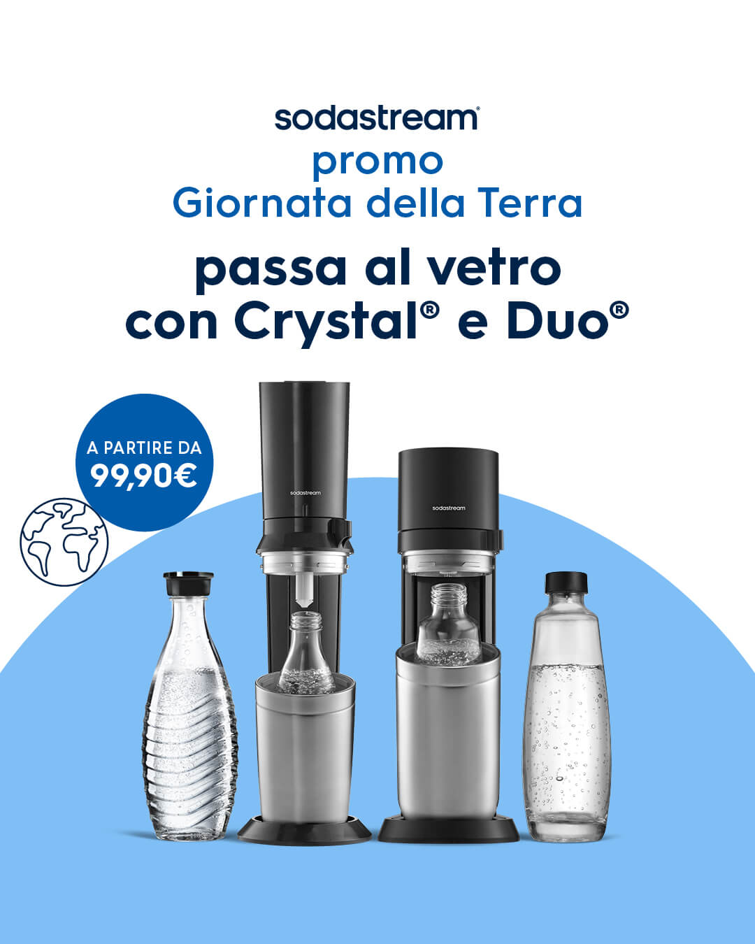 Con le promozioni sui gasatori Crystal 3.0 e Duo Mega Pack passi al vetro e sostituisci per sempre la plastica monouso in casa. Approfitta anche delle offerte sulle bottiglie in vetro extra per fare scorta di bollicine.