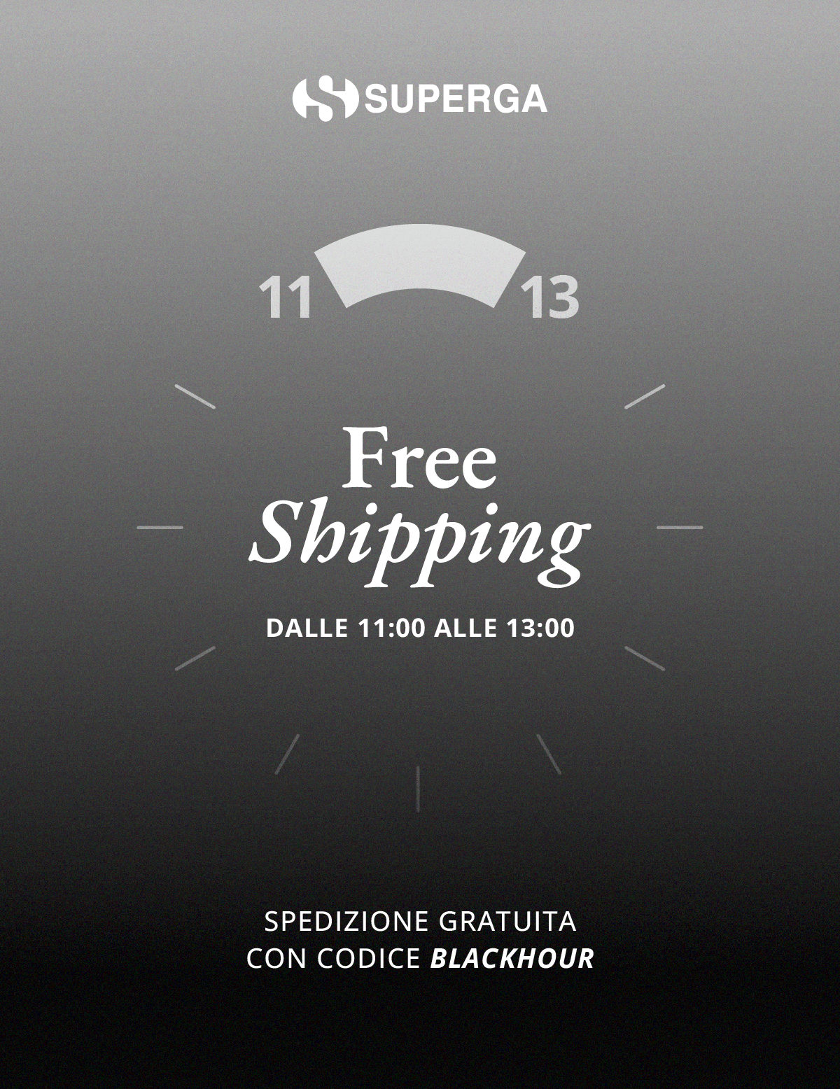 *Codice valido su Superga.com, su tutti gli ordini. Si applica al checkout ed è valido solo il 28 novembre, dalle ore 11:00 alle ore 13:00. Non cumulabile con altri codici sconto. |