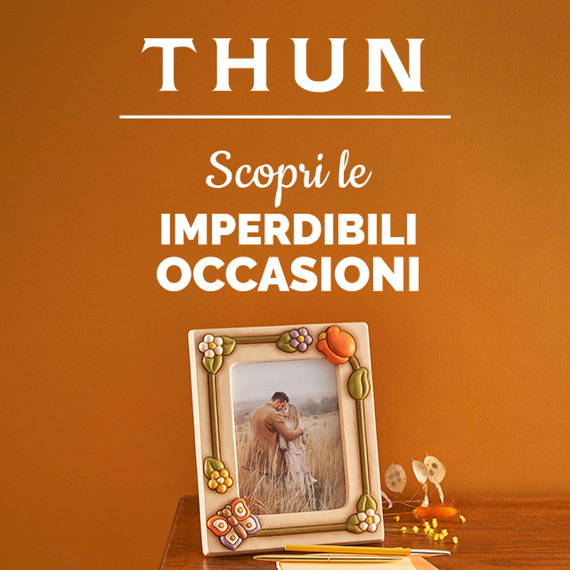 *Promozione riservata agli iscritti al Programma Fedeltà THUN Lovers, valida dal 27 ottobre fino al 3 dicembre 2023. Hanno diritto al Buono Sconto 30% coloro che hanno speso almeno 55€ in prodotti della collezione I Classici THUN nel periodo della promozione. Verrà emesso un Buono Sconto 30% per ogni scontrino. Il Buono sconto sarà visibile sul proprio profilo THUN Lovers a partire dal 15 febbraio 2024 e utilizzabile fino al 3 marzo 2024, una sola volta e su un solo scontrino, e sarà applicato sul prodotto più caro.