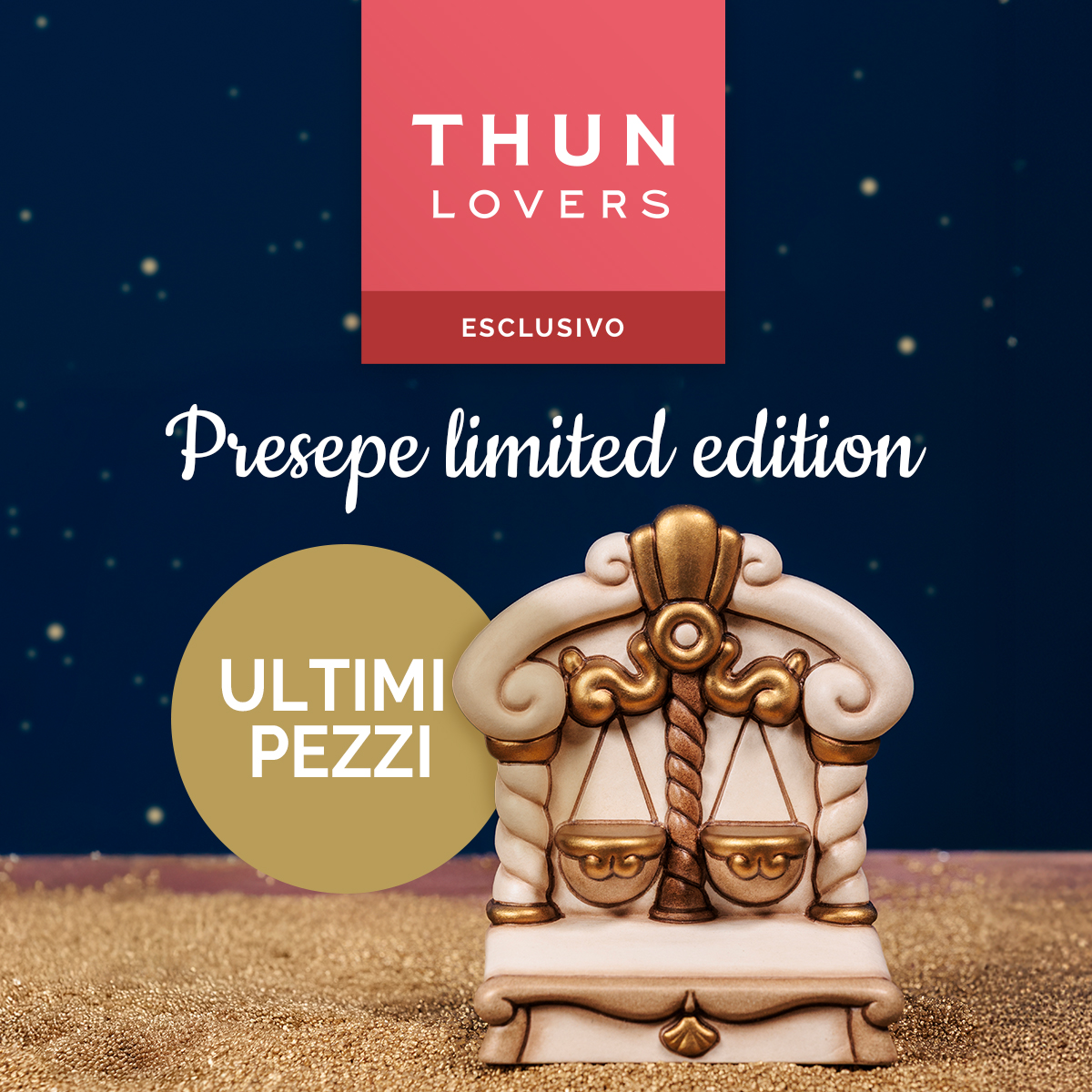 *Dal 16/10/2025 fino a esaurimento scorte, i clienti iscritti al Programma Fedeltà THUN Lovers potranno acquistare online oppure prenotare in negozio, il nuovo pezzo Limited Edition Bilancia (codice prodotto T10443282A88). L’ordine è vincolato all’acquisto di almeno un pezzo della nuova collezione Presepe 2025. Sarà possibile inserire massimo 1 ordine per cliente lovers e la consegna avverrà nelle settimane successive. Clicca qui per scoprire i prodotti che aderiscono alla Promozione