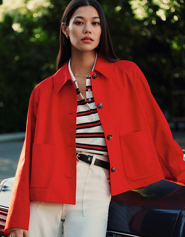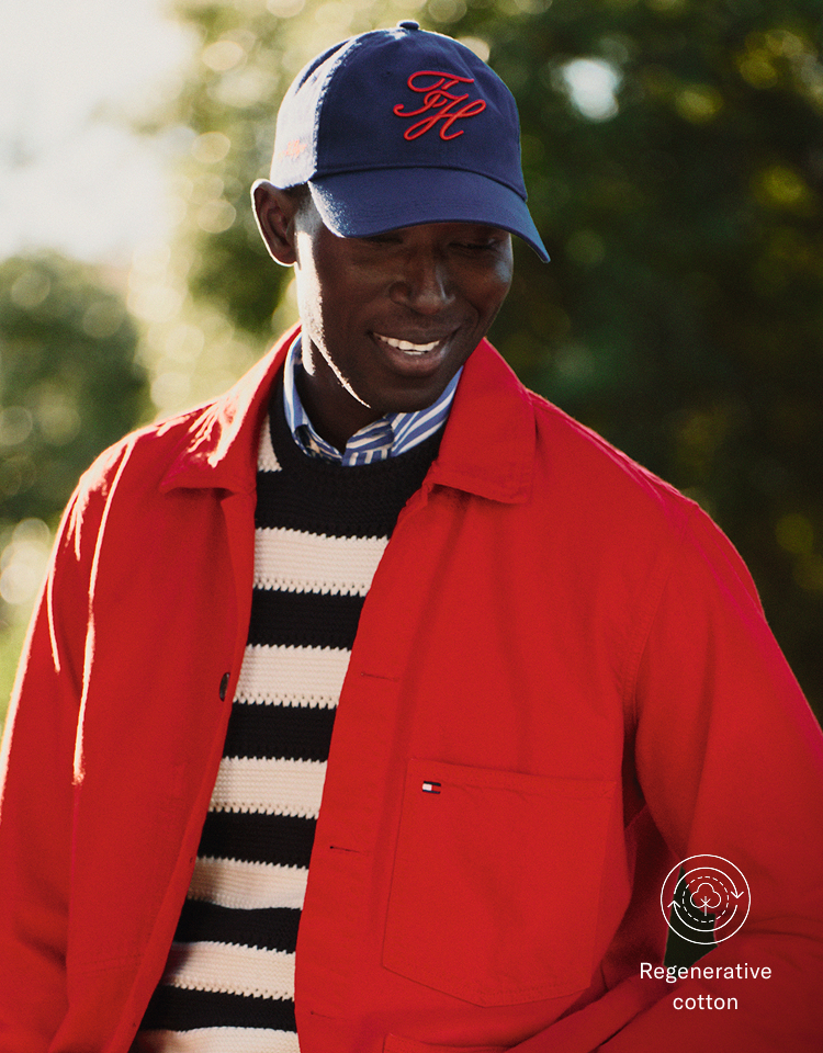 Una giacca in cotone rigenerativo abbinata a capi a righe per un look esclusivo nei colori rosso, bianco e blu di Tommy Hilfiger.