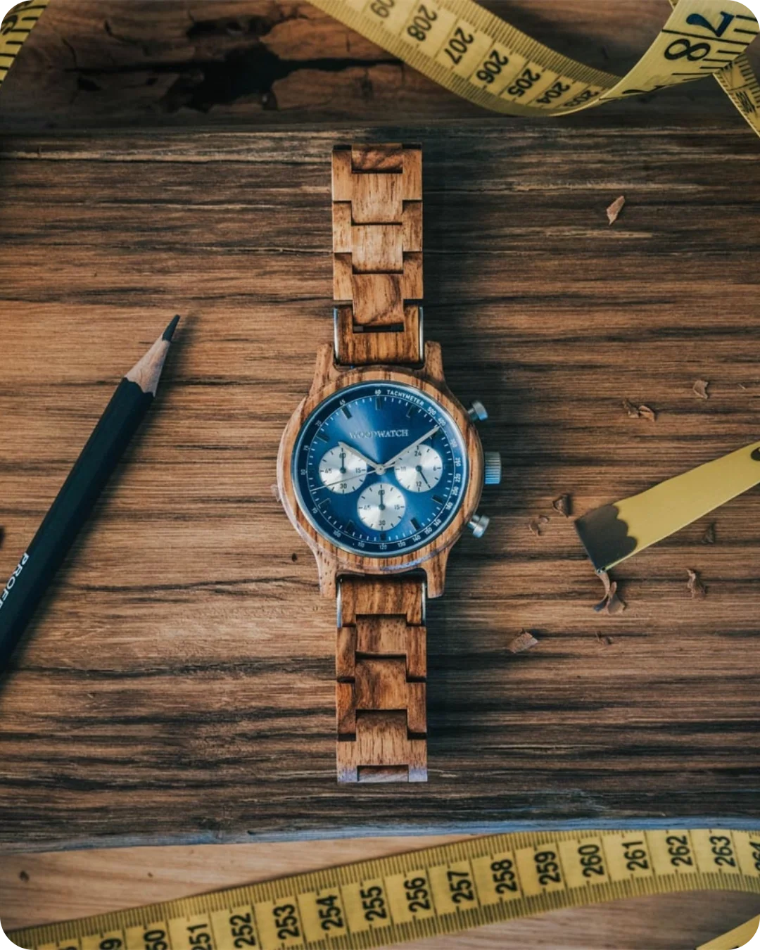 It's a watch with warm wood tones and blue dial. It gives me a clean look that works anywhere, from relaxed days to the city.