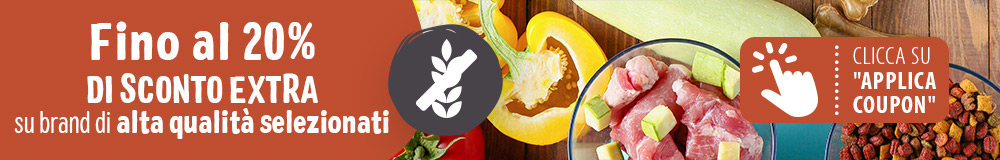 | | | | | *Codice coupon valido fino all'11 Marzo incluso. È possibile utilizzare un solo codice per ordine. Valido solo su prodotti senza cereali dei seguenti marchi: Barkoo, Briantos, Catessy, Concept for Life, Concept for Life Veterinary Diet, Feringa, Greenwoods, Lukullus, Lukullus A Casa, Phil & Sons, Purizon, Rebel Belle, Rosie's farm, Smilla, Wild Freedom, Wolf of Wilderness. Non cumulabile con altre offerte e promozioni. |