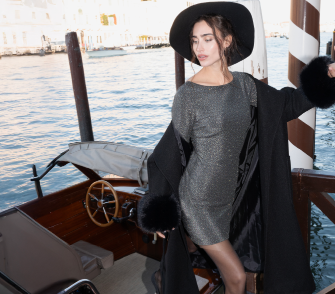 Il mini dress lurex abbinato al cappotto con dettagli fur è la combo perfetta per un look elegante che cattura la luce a ogni passo.
