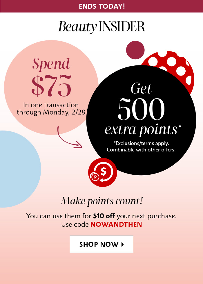 *One-time offer valid for Beauty Insider members who make a single merchandise purchase of at least $75 between 12:01 am PT on 2/18/22 and 11:59pm PT on 2/28/22 in Sephora US stores, Sephora Canada stores, on sephora.com, and on sephora.ca. Must present or enter promotion code at checkout to redeem. Buy Online, Pick Up In Store orders placed after 2/28/22 do not qualify. Bonus points will be automatically credited to your Beauty Insider account within 24 hours after purchase. Must be subscribed to Sephora marketing emails to receive confirmation of bonus points. Limit one bonus points offer per Beauty Insider account. Sephora is not responsible for damaged, lost, or stolen offer materials. Promotion offer and points have no cash value and may not be altered, bartered, sold, or transferred. Previous purchases, purchases of gift cards, FLASH, gift wrapping, packaging, taxes, or shipping and handling charges do not apply toward $75 minimum spend. Entire merchandise return will result in deduction of awarded points. Partial merchandise returns that reduce merchandise total to less than $75 will result in deduction of awarded points. Due to heavy demand, Sephora FLASH delivery times cannot be guaranteed for this promotion. Sephora, JCPenney, and Kohl’s employees are not eligible for this offer. Sephora may modify or cancel offer at any time.