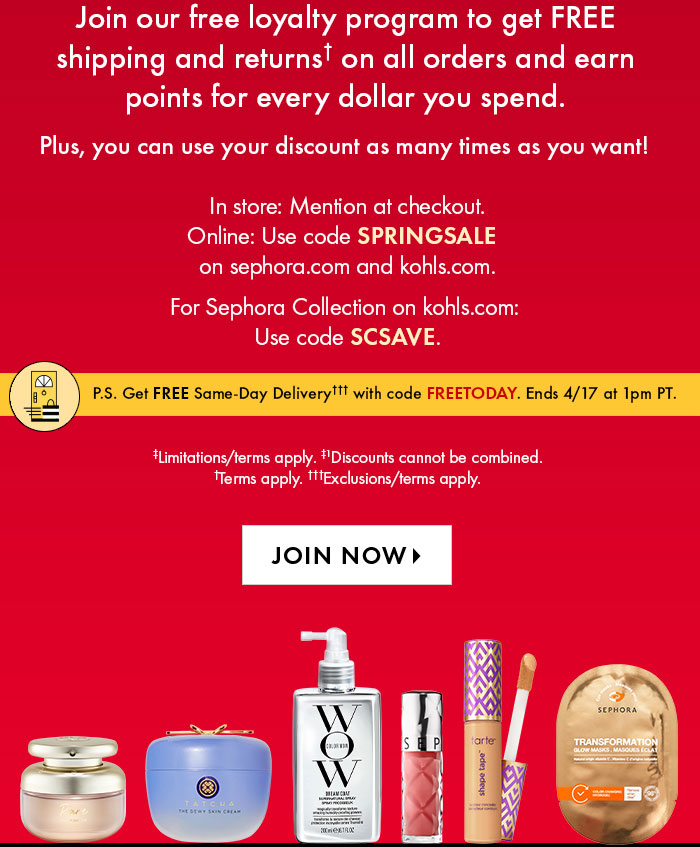 | ‡20% offer valid for Rouge members 4/10/26–4/20/26 at 11:59pm PT; 15% offer valid for VIB members 4/14/26–4/20/26 at 11:59pm PT; and 10% offer valid for Insider members 4/14/26–4/20/26 at 11:59pm PT. Offer only valid on merchandise purchases made in Sephora US and Canada stores, Sephora at Kohl’s, Instacart, DoorDash, and on sephora.com, sephora.ca, and kohls.com. Must present coupon in store or enter code online. Buy Online, Pick Up In Store orders placed after 4/20/26 do not qualify. Limitations: two Dyson items, three Shark Beauty items, and three The Ordinary items per SKU per transaction. Not valid on Sephora Collection products, Byredo, in-store services, previous purchases, purchases of gift cards, purchases of Same-Day Unlimited subscriptions, packaging, taxes, or shipping and handling charges. Return of discounted merchandise will be for price actually paid. Sephora/Kohl’s is not responsible for damaged, lost, or stolen offer materials or barcodes. Offer has no cash value and may not be altered, sold, bartered, or transferred. Applicable Beauty Insider status must be attained prior to redemption. Same-Day Delivery available only at select Sephora stores. Cannot be used in conjunction with other offers, Beauty Insider Cash, Rouge Cash, Rouge Reward, or rewards, unless otherwise specified by Sephora, except for Credit Card Rewards. Sephora employees are not eligible for this offer. Sephora/Kohl’s may modify or cancel offer at any time, in its sole discretion. See Beauty Insider Terms for details, including exclusions on what purchases qualify toward spend thresholds. ‡1 30% off Sephora Collection merchandise valid for Beauty Insider members 4/10/26–4/20/26 at 11:59pm PT. Offer only valid on Sephora Collection merchandise purchases made in Sephora US and Canada stores, Sephora at Kohl’s, Instacart, DoorDash, on sephora.com, sephora.ca, and kohls.com. Must present coupon in store or enter code online. Buy Online, Pick Up In Store orders placed after 4/20/26 do not qualify. Not valid on in-store services, previous purchases, purchases of gift cards, purchases of Same-Day Unlimited subscriptions, packaging, taxes, or shipping and handling charges. Sephora/Kohl’s is not responsible for damaged, lost, or stolen offer materials. If discounted merchandise is returned, the actual price paid will be refunded. Offer cannot be used in conjunction with other promotional offers, Beauty Insider Cash, Rouge Cash, Rouge Reward, or rewards, except for Credit Card Rewards. Offer has no cash value and may not be altered, sold, bartered, or transferred. Cannot be used in conjunction with Sephora Savings Event discount. Sephora employees are not eligible. Sephora/Kohl’s may modify or cancel offer at any time, in its sole discretion.